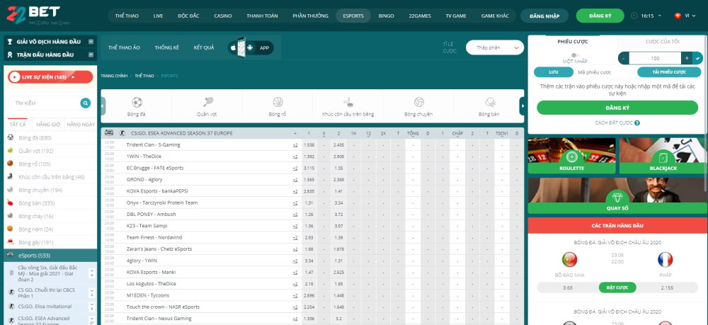 Dịch vụ 22BET cá cược trực tiếp và phát sóng trực tiếp