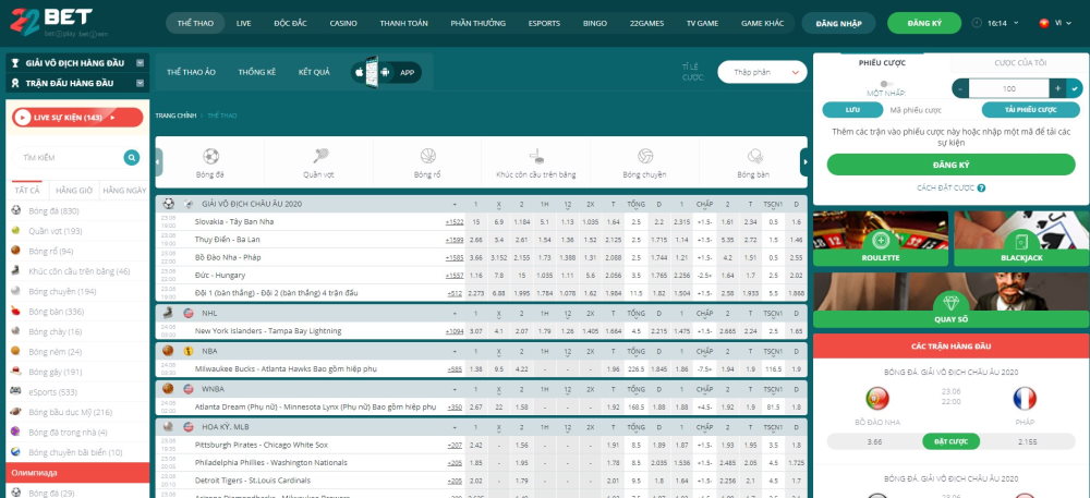 Hiện nay, 22BET cung cấp cho người chơi nhiều môn thể thao phổ biến và được yêu thích trên thị trường bao gồm bóng đá, quần vợt, bóng rổ, khúc công cầu trên băng…đi kèm với đó là các kèo cược nổi bật như kèo châu Á, kèo châu Âu, kèo Tài/Xỉu,…Ngoài ra, để tăng thêm sự lựa chọn cho khách hàng, 22BET còn triển khai nhiều kèo cược phụ độc đáo khác như kèo đội dành chức vô địch, đội ghi bàn trước,…